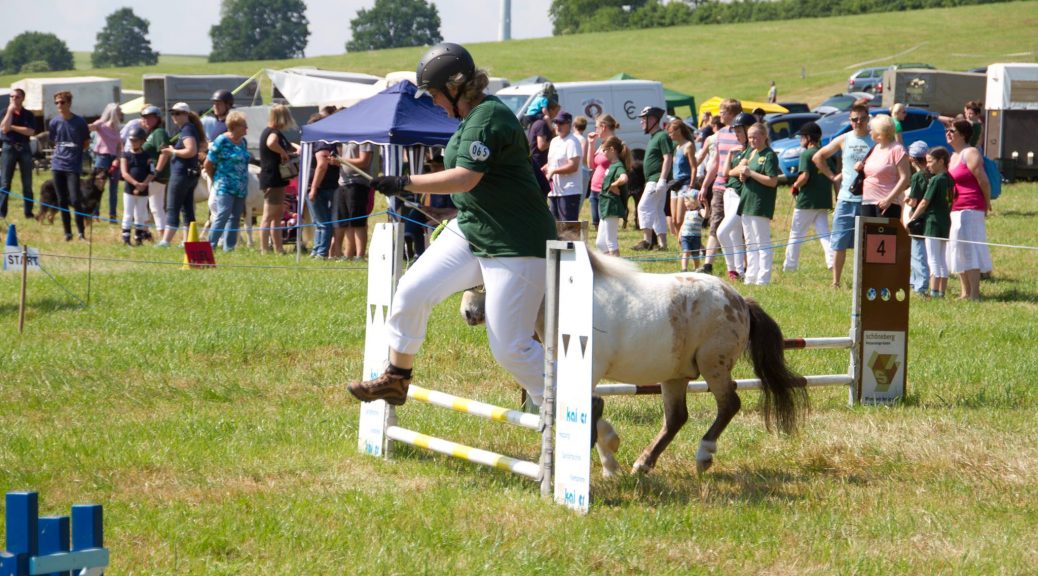 Mit schlappen 200 km Anfahrt – und ja, das war eines der nächstgelegenen Turniere – haben wir uns also in das schöne Lothe bei Paderborn begeben, wo bei strahlendem Sonnenschein auf einer Wiese an einem Kuhstall die hübschen Parcours aufgebaut waren und auch schon viele Shettys, große und kleine Menschen rumwuselten. Im feschen vorgeschriebenen Outfit (weiße Hose, dunkelgrünes Tour-T-Shirt, das alle Teilnehmer erhalten, Handschuhe und Kappe) ging’s ab ins Getümmel. Wegen der vielen teilnehmenden Kinder gibt’s bei der IG Shetland bezüglich der generellen Kappenpflicht gar keine Diskussion – und das finde ich gut so!