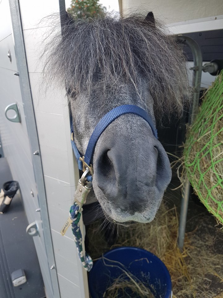 Zumindest bis wir Henry im Juni einschläfern mussten, denn ab da ergaben sich einige fast schon merkwürdige Zufälle. Nur drei Tage nach Henry’s Tod war ich auf der Seite der IG Shetland auf der Suche nach einer Turnierinformation über den Marktplatz gestolpert. Und welches Pony strahlte mich dort an: das graue Minikaltblut im Winterpuschel. Ein Telefonat mit dem Züchter, noch emotional aufgewühlt von Henry’s Tod und mit teilweise tränenerstickter Stimme, Austausch von Bildern zwei und vier Wochen später… wir haben in der Zeit zwischen dem ersten Telefonat und unserer Fahrt nach Westerstede zu Ibo sogar noch andere, teilweise fertig ausgebildete Ponys angeguckt und sogar probegefahren, aber nirgendwo hat es geklickt. Ibo’s Halbbrüder waren schon längst verkauft, und Ibo wäre beinahe in die Schweiz gegangen, aber eben nur beinahe. Er hat eben seit Januar darauf gewartet, das wir ihn abholen. Ich behaupte einfach, das sollte so sein. Und darüber freuen wir uns!